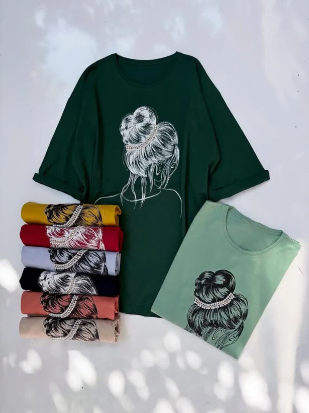تیشرت لانگ مو گوجه ای نگین دار مرواریدی